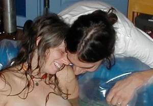 Transition hit, as we knew it would. Now I was on my knees, hanging over the side of the pool with my arms around David’s neck. I just stayed there, squeezing during contractions, and collapsing on his shoulder in exhausted silence in between. The interesting sensations were really hurting now, so that I wondered what was wrong, and wondered who had designed the process, and considered never having any more children. I didn’t vocalize any of this because I couldn’t during a contraction and I was too wiped out in between. I suspect I had all the same thoughts during Ada’s birth five years ago, but that one has faded to a rosy glow by now, with the unpleasant bits missing.
