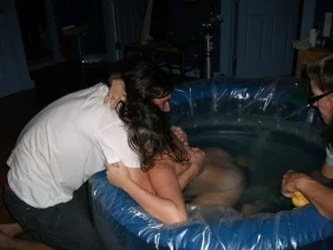 So I got to stay in the pool but I soon discovered that the contractions were now intense enough that I didn’t notice the pain relief of the hot water. Between contractions, though, I was able to relax so fully that it was worth it. And the greatest benefit of the pool was the buoyancy–I did not have to hold my body up against the persistent pull of gravity!