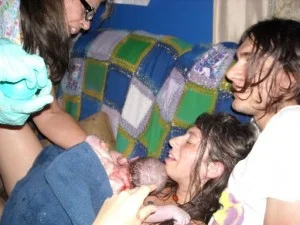 After a few moments, Jill said, “Okay—get her on the couch!” David was already behind me and lifted me by the arms, while the midwife and her assistant grabbed my legs and hauled me over to the couch a few feet away. I assumed it was shoulder dystocia, which we had experienced with my first daughter’s birth. Later I asked Jill about it and she told me that the baby’s head was born face down (anterior, as it should be) but had not rotated to line the shoulders up in the optimum position for birth. Jill was unable to get a purchase on the baby under the water and had me moved to the couch so that she could manually turn the baby.